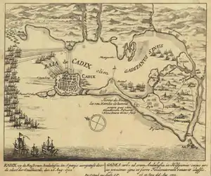 Don Francisco del Castillo, Marquis of Villadarias, was given command in the threatened province of Andalusia.[13] Cádiz, Andalusia's main city, held a garrison of some 300 poorly equipped men with a similar number lining the shore, but the sudden appearance of the Allied fleet engendered a state of emergency, and, in Philip Stanhope's words, ‘the spirit and determination to repel it’.[14] The wealthy cities of Cordova and Seville contributed to the Spanish cause, the nobles took up arms, and the local peasantry were organised into battalions, so that after boosting the city's garrison Villadarias could still muster in the field five or six hundred good horsemen, and several thousand militia.[15] To increase the strength of his position further, the Spanish commander secured the harbour by drawing a strong boom and sinking two large hulks across its entrance.