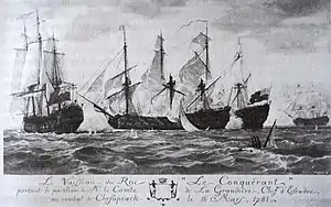 | Conquérant | 74-gun | 74 | La Grandière[19] | 43 | 50 | 93 [4] | Lost her rudder and most of her rigging [20] | |||
