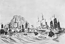 The First Battle of Chuenpi[2] (Chinese: 穿鼻之戰) was a naval engagement fought between British and Chinese ships at the entrance of the Humen strait (Bogue), Guangdong province, China, on 3 November 1839 during the First Opium War. The battle began when the British frigates HMS Hyacinth and HMS Volage opened fire on Chinese ships they perceived as being hostile.