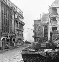 Near the city centre there was an engagement with a German Panther tank; this skirmish was captured on film by US cameramen from the 165th Photo Signal Company.[4] The German Panther was lying in ambush near the train station; two advancing Sherman tanks were slowed down by a pile of rubble. The Shermans got stuck in a narrow street, which made them an easy target for the German tank. Two of the Panther's 75mm shells hit the turret of the leading Sherman, a third shell hit the tracks of the second Sherman tank behind it. A nearby Pershing tank was sent to take out the Panther, the two tanks were in each other's sight, but the German tank commander believing it to be a German tank, told his gunner to hold fire, he had never seen a Pershing. Finally the Panther tank was taken out by the advancing Pershing.