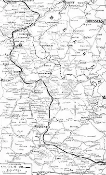 Roulers fell the next day and by 16 October, the British held the north bank of the Lys up to Harelbeke and had crossed the river at several points.[6] By 17 October, Thourout, Ostend, Lille and Douai had been recaptured; Bruges and Zeebrugge fell by 19 October and the Dutch border was reached the following day.[7] The crossing of the Lys and the capture of Courtrai by the British Second Army on 19 October, led to a German retreat on the front of the Fifth Army further south, which encircled Lille on 18 October.[8] Next day the British were in Roubaix and Tourcoing and by the evening of 22 October, the British had reached the Scheldt from Valenciennes to Avelghem.[9]