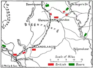 The way was now clear for the British detachment at Dundee to fall back on the main British force, but Sir George White feared that 10,000 Boers from the Orange Free State were about to attack Ladysmith, and ordered the force at Elandslaagte to fall back there. The British were tired and many officers had been killed, and the retreat became a disorderly scramble.[8] The detachment at Dundee was once again isolated, and was forced to make an exhausting detour before they could reach safety. The Boer forces re-occupied Elandslaagte two days later.[9]