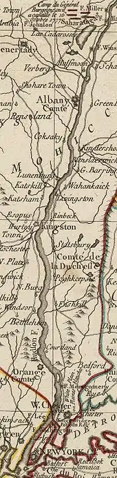 The Hudson River valley was a strategically critical area throughout the American Revolutionary War. Through this area moved supplies, men and materiel between the New England states and those further south, something that became vitally important when the British largely abandoned New England as an objective of military control later in the war. In June 1777, General John Burgoyne began an attempt to gain control of this key area by moving south from the British province of Quebec. After his early success at Ticonderoga, his campaign become bogged down in logistical difficulties, not reaching Saratoga, New York, until mid-September.[5] Burgoyne held expectations that his campaign would be supported by military forces based in New York City under the command of General William Howe and that the forces would meet at Albany, about 40 miles (64 km) south of Saratoga.[6]