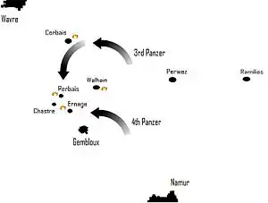 Meanwhile, infantry of 3rd Panzer Division attacked from Walhain-St.Paul against Perbais at 09:15, but they too stuck fast by 11:00. The war diarist of XVI Corps complained that the tanks of 4th Panzer had joined the fray before the anti-tank obstacle had been cleared. The corps operations officer of French descent, Chales de Beaulieu, criticised the 3rd Panzer Division for allowing its infantry to bog down while leaving its tanks in reserve.[31]