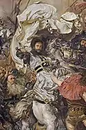 Another central scene depicts the death of the Grand Master of the Teutonic Order, Ulrich von Jungingen. Dressed in white Order garb and riding a white horse, von Jungingen is being killed by two anonymous figures, which historian of art Danuta Batorska identifies as "savage looking Lithuanian peasants".[1] One of them wields a Saint Maurice Spear (one of the objects with the claim to be the Spear of Destiny), which according to historian of art Jarosław Krawczyk implies that Matejko saw Jungingen's death as a retribution for taking arms against another Christian ruler.[10] Next to the spearman is an executioner, who symbolizes the punishment Jungingen receives for the Order raids and pillages against the common folk.[10] Those symbolic figures are one of many liberal interpretation that Matejko took with his painting; furthermore, modern scholarship indicates that he died in a cavalry duel, and not at the hands of a peasant.[3]