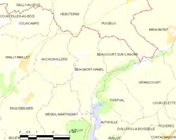 ![]() Modern map of the municipality Beaumont-Hamel. Serre is on the Mailly-Maillet–Puisieux road. | |||||||