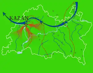 The Battle of Kazan (1774) was a major battle during Pugachev's Rebellion. It took place on 12–15 July 1774 in Kazan, Russia, and the surrounding area. The first stage began in the morning of 12 July, when rebels under Yemelyan Pugachev defeated government troops and besieged them in the Kazan Kremlin. During the battle some government forces defected to the rebels' side. However, in the evening, tsarist forces under Johann Michelson reached Kazan and defeated the rebels in two battles which took place on 13 and 15 July, forcing Pugachev to retreat to Tsaryovokokshaysk and then to cross the Volga. Out of 25,000 and 15,000 rebels who participated in the first and last stages of the battle respectively, only 500 escaped.[1]