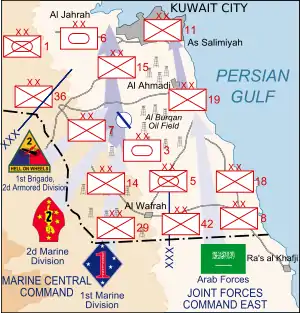 During the buildup of forces, the U.S. had built observation posts along the Kuwaiti-Saudi Arabian border to gather intelligence on Iraqi forces. These were manned by U.S. Navy SEALs, U.S. Marine Corps Force Reconnaissance and Army Special Forces personnel. Observation post 8 was farthest to the east, on the coast, and another seven observation posts were positioned each 20 km (12 mi) until the end of the "heel", the geographic panhandle of southernmost Kuwait. Observation posts 8 and 7 overlooked the coastal highway that ran to Khafji, considered the most likely invasion route of the city.[45] 1st Marine Division had three companies positioned at observation posts 4, 5 and 6 (Task Force Shepard), while the 2nd Marine Division's 2nd Light Armored Infantry Battalion set up a screen between observation post 1 and the Al-Wafrah oil fields.[46] The U.S. Army's 2nd Armored Division provided its 1st Brigade to give the Marines some much needed armored support.