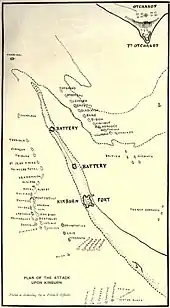 The fortress was located on the Kinburn Spit, at the extreme western end of the Kinburn Peninsula, and consisted of three separate fortifications. The primary fort, built of stone, square, and equipped with bastions, held 50 guns, some of which were mounted in protective casemates; the rest were in en barbette mountings, firing over the parapets. Two smaller fortresses were located further down the spit, mounting ten and eleven guns, respectively. The first was a small stone fort, while the second was a simple sand earthwork. The forts were armed only with medium and smaller calibre guns, the largest guns being 24-pounders. Major General Maxim Kokhanovitch commanded the garrison of 1,500 men, most of whom were stationed in the main fort. Across the estuary was Fort Nikolaev in the town of Ochakov with fifteen more guns, but these were too far away to play a role in the battle.[5][6]
