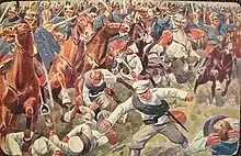 ![]() Front side of Open Letter (Carte Postale) issued in c. 1914 with view of attack of Austro-Hungarian dragoons on Russian infantry at Krasnik (August 1914) | |||||||