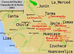 Del Canto's division was scattered through the southern region of the Peruvian Andes, divided into small groups stationed in several towns and enduring a severe lack of supplies including food, clothes, shoes, and ammunition, and heavy casualties from disease and the cold of these heights. In fact, the most common causes of death in the Chilean division were typhus and frostbite.[3] The Chilean high command was reasonably very concerned about the situation of the soldiers, and requested of the Chilean authorities permission to leave the mountains, but these requests fell on deaf ears. When the situation turned desperate, Col. del Canto himself traveled to Lima to request authorization to retreat. After the report of Dr. Jovino Novoa about the troops' situation, permission to retreat was granted.[4]