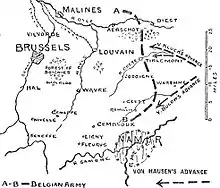 The Army of the Meuse (General Otto von Emmich) consisted of the 11th Brigade of III Corps (Major-General Friedrich von Wachter), the 14th Brigade of IV Corps (Major-General Friedrich von Wussow), the 27th Brigade of VII Corps (Colonel Benno von Massow), the 34th Brigade of IX Corps (Major-General Richard von Kraewel), the 38th Brigade of X Corps (Colonel Oertzen) and the 43rd Brigade of XI Corps (Major-General Hülsen).[17] The cavalry component consisted of Höherer Kavallerie-Kommandeur II (II Cavalry Corps [HKK II]), Lieutenant-General Georg von der Marwitz), consisting of the 2nd (Major-General Friedrich von Krane), 4th (Lieutenant-General Otto von Garnier) and the 9th (Major-General Karl-Ulrich von Bülow) cavalry divisions.[18] (A German Cavalry Corps was not an army corps in the conventional sense but the largest German cavalry unit that operated in 1914 and was known as a Höheres Kavallerie-Kommando.) The Army of the Meuse had c. 59,800 troops with 100 guns and howitzers, accompanied by Erich Ludendorff as an observer for the General Staff.[10]