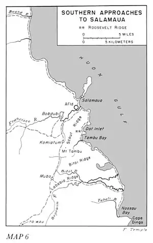 In the aftermath of the fighting around Mubo, fighting in the Salamaua area continued. With the Allies making ground closer to Salamaua, the Japanese withdrew to avoid encirclement. To the Allied planners, Salamaua itself was not considered important, but they hoped that maintaining pressure on the Japanese in the area would serve to draw reinforcements away from Lae, where a seaborne landing was planned for mid-September in conjunction with an airborne landing at Nadzab as part of a wider pincer movement to capture Lae itself.[29] Thus, further actions were fought throughout July and August around Roosevelt Ridge, Komiatum and Mount Tambu,[30] prior to the final capture of Salamaua on 11 September following advances by the Australian 15th and 29th Brigades, and the US 162nd Infantry Regiment.[31]