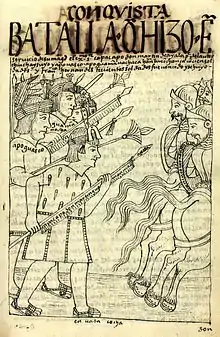 The attack was led by Hernando Pizarro, the senior Spanish commander in Cusco, with a force of 100 Spaniards (30 infantry, 70 cavalry) and an estimated 30,000 native allies.[22] One of his main assets against the Inca armies was the Spanish cavalry because horses provided a considerable advantage in hitting power, maneuverability, speed, and stamina over Inca warriors.[23] All Spaniards wore some kind of armor, the most commonly used types were chain mail shirts and padded cloth armor which were lighter and cheaper than full armor suits; they were complemented by steel helmets and small iron or wooden shields.[24] The main Spanish offensive weapon was the steel sword, which horsemen supplemented with the lance; both weapons could easily penetrate the padded armor worn by Inca troops.[25] Firearms, such as arquebuses were rarely used during the Spanish conquest of Peru because they were scarce, hard to use, and despised by horsemen as an ungentlemanly weapon.[26] Spaniards relied heavily on Indian auxiliaries because they provided thousands of warriors as well as support personnel and supplies.[21] These native troops had the same sorts of arms and armor as their Inca counterparts. During the Ollantaytambo campaign, the Pizarro expedition included thousands of auxiliaries, mainly Cañaris, Chachapoyas, and Wankas, as well as several members of the Inca nobility opposed to Manco Inca.[27]