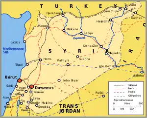In 1941, the Vichy French had substantial forces in the region and had allowed their air bases to be used as staging posts by the Germans to send aircraft to take part in the Anglo-Iraqi War. They had also allowed the Germans to use the railway system to send arms and ammunition to Iraq.[1] On 8 June 1941, the Allies had launched two northerly attacks from Palestine and Trans-Jordan into Lebanon and Syria to prevent any further interference to Allied interests in the region. By late June, Damascus had been taken and the Allied campaign commander, Henry Maitland Wilson was ready to launch two further thrusts, this time from western Iraq to complete the capture of Syria.