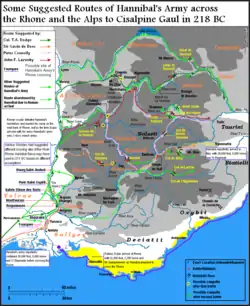 - At the time, the Gallic tribes that inhabited the eastern bank of the river were the Sallyas, who lived next to the territory of Massalia, the Cavari, a Gallic tribal confederation who lived to their north, the Vocontii to the north of the Cavari and the Allobroges to the north of the Vocontii.[127]