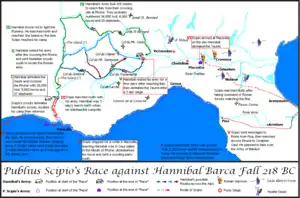 Publius Scipio, as anticipated by Hannibal, after his scouts reported Hannibal's location, immediately loaded his heavy baggage on his ships, marshaled his legions, and with all due haste marched north to confront the Carthaginians.[187] However, when the Romans reached the Carthaginian campsite, Scipio found a deserted camp and locals informed him that Hannibal's army was three day's march away.[197] Scipio was again amazed that Hannibal decided to cross the Alps as autumn was ending,[198] but he probably did not contemplate chasing after the Carthaginians, it might not be possible to overtake the Carthaginians as they had a sizable head start, and Scipio did not know Hannibal's route, and the Roman army was not equipped and provisioned for a winter campaign.[177] Forced marching blindly into unknown territory to catch Hannibal risked being ambushed by Hannibal or hostile Gallic tribes. In an exhausted state,[132] the army had a few days of supplies, all heavy baggage was in their ships, no arrangements had been made with Massalia for provisions, foraging would slow the army down and make it impossible to catch the Carthaginians,[185] the Alps had little food or forage[199] and the Carthaginians would have cleaned the area they passed through of food and fodder as Hannibal's men were also depended on foraging,[193] making it impossible for the Romans to live off the land. Scipio concluded that Hannibal was heading towards Italy and turned south towards Massalia.[132] The race for Italy had begun.