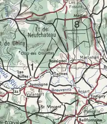 The 3rd Colonial Division at Rossignol, cut into two by the destruction of the bridge, hurriedly organised the defence of the village. The forward elements were still fighting a retreat from the woods and he had no means of communication with that part of his division trapped south of the river.[35] The 1st and 2nd battalions of the 3rd Colonial Infantry Regiment, unable to join their third battalion at Rossignol instead attacked the Germans to the west at Termes. Suffering losses from artillery and machine-gun fire from Termes and in their rear from Ansart they were eventually forced to retreat to Jamoigne.[34]