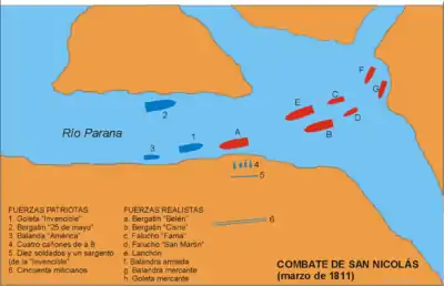 The Battle of San Nicolás was a naval engagement on 2 March 1811 on the Paraná River between the Spanish royalists from Montevideo, and the first flotilla created by the revolutionary government of Buenos Aires. It was the first engagement between the two fleets in the Río de la Plata region since the revolution, and a royalist victory.