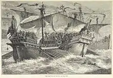 Eustace's own vessel, the Great Ship of Bayonne led the French squadron. Robert de Courtenay held the top command while Eustace served as his deputy. Ralph de la Tourniele and William des Barres were third and fourth in command, respectively. All told, there were 36 knights on the flagship. The next three troopships were commanded by Mikius de Harnes, William V of Saint-Omer, and the Mayor of Boulogne. Altogether, the first four ships, including the flagship, contained between 100 and 125 knights. Men-at-arms manned the remaining six troopships. There were 70 smaller vessels which carried supplies.[11] All eleven troopships were overloaded, particularly the flagship which carried a large trebuchet and horses destined for Prince Louis.[8]
