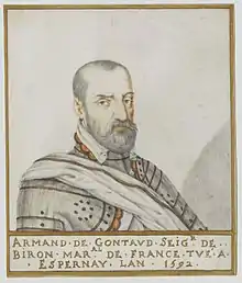 Despite their numerical superiority, the combined forces led by Biron and Sir John Norreys, who commanded the English infantry[11] along with the Welsh Captain Roger Williams,[12] the just officer who put some order in defending the Spanish attack, were literally swept away by the Spanish cavalry, and then by the infantry,[3] suffering heavy losses, thanks also to the bombardment success of the guns of Don Hernando de Acosta, Lieutenant-General of the artillery of the Army of Flanders, who had a very important role in the battle.[3][7] The forces of Biron and Norreys suffered at least 3,200 casualties, and almost all the baggage, barrels of gunpowder, 36 flags, and 3 banners captured.[3] On the Spanish side the casualties were 400 dead or wounded.[7] The French Marshal himself, who tried to repel the attack of the Spaniards, fell from his horse and broke his leg.[13]