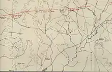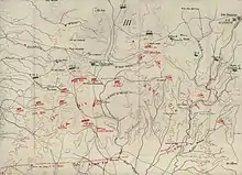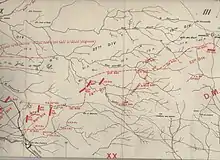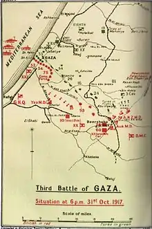Four Ottoman divisions fought in the area: the 19th, 24th and 27th Divisions, and the 3rd Cavalry Division.[29][30] During the battle on 31 October, the Ottoman III Corps headquarters had retreated from Beersheba to Tel es Sheria but, the next day (1 November), moved to support the defence of the Jerusalem road from Edh Dhahriye. They were followed by the 143rd Regiment (24th Division) and 1,500 rifles of the Beersheba Group, which had been reorganised at Tel es Sheria. This latter group moved to defend Tel el Khuweilfe.[31] On 1 November, the 125th Regiment (16th Division) also moved west into the hills coming under the command of the 27th Division, while the 6th Cavalry Regiment covered the Ottoman left flank to Yutta.[32] Kress von Kressenstein also sent the 19th Division to reinforce the Seventh Army in the area.[29] This strong Ottoman presence defending the area was designed to encourage Allenby to commit more units to the attack, to take the pressure off the Ottoman forces defending Gaza and Sharia, and to lessen the possibility of an EEF breakthrough.[33][Note 3]