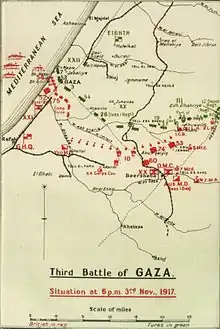 The 159th Brigade on the left was ordered to advance on Ain Kohle, but could not move forward. Several urgent requests were made during the day for a mobile reserve of a brigade or a regiment, but they were denied by Chauvel, who could not spare the reinforcements.[124] Although the attack by the 53rd (Welsh) Division had been very confused, suffering a "bloody defeat" instead of a "conquest", the 19th Division was stopped from moving back to reinforce Tel esh Sheria. The continuing threat of an attack up the road to the headquarters of the Seventh Army at Hebron and on to Jerusalem, was maintained by the repeated attacks on Tel el Khuweilfe by the 53rd (Welsh) Division.[125] By the end of the day, the Ottoman defenders had succeeded in defeating the British infantry attacks on Tel el Khuweilfe, and continued to hold Tel esh Sheria, but they had begun to evacuate Gaza.[126] At nightfall, Chauvel issued orders for the Anzac and Australian Mounted Divisions to begin their advance northwards via Sheria towards Jemmameh and Huj, while Barrow commanding the Yeomanry Mounted Division was to take command of the force at Tel el Khuweilfe, including the 53rd (Welsh) Division.[112]