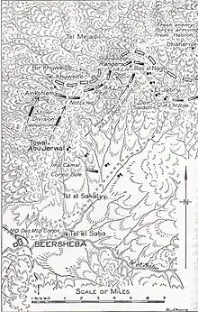 The strategically important height of Tel el Khuweifle not only dominated all the surrounding country, but was also the site of the best water supply in the area.[18][19] However, the EEF had discovered important but scarce water supplies during the day of battle on 31 October. Water was found east of Beersheba by the New Zealand Mounted Rifles Brigade, in the Wadi el Malah, while the 2nd Light Horse Brigade found sufficient water for three brigades in a small wadi north of Bir Hammam, and a good supply in the Wadi Hora.[27] The Auckland Mounted Rifle Regiment also found enough water for a whole brigade in the Bir Salim Abu Irgeig wadi.[28]