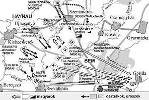 After Haynau saw the Hungarian army advancing towards his legion, he gave the order to attack the Hungarians: he sent 12 cannons. Bem ordered six cavalry troops and one cannon to attack Haynau. It was successful and the Austrians had to retreat. Furthermore, Haynau's legion mixed up the advancing Russian army. Haynau attacked back with fourteen cavalry troops and sent an order to Liechtenstein that he had to advance to Szentandrás (now Sânandrei, in Romania) and attack the right Hungarian flank.
