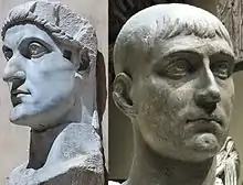 ![]() Left : Head of the Colossus of Constantine , Vatican Museums ; Right : Bust of Magentius at the Pushkin Museum | |||||||