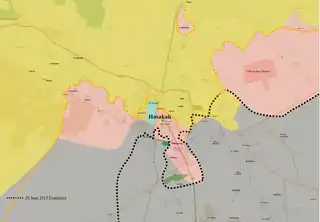 The 2015 Battle of al-Hasakah started as an offensive launched in the Al-Hasakah Governorate during the Syrian Civil War, in which the Islamic State of Iraq and the Levant (ISIL) attempted to capture the city of Al-Hasakah, which was divided into two areas held separately by the Syrian Armed Forces and the Kurdish People's Protection Units (YPG).[29] On 17 July, YPG-led forces captured all of the roads and villages surrounding Al-Hasakah, fully besieging the ISIL militants remaining inside of the city.[30][31] On 28 July, YPG forces and the Syrian Army expelled ISIL from most of Al-Hasakah,[5][3] with two ISIL pockets persisting near the Al-Zuhour District[32] and the southern entrance.[33] On 1 August, the city was fully cleared of ISIL fighters.[34][9][1]