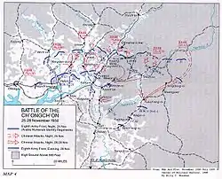 After the successful attack against the Eighth Army's right flank, the PVA High Command gave the go ahead for the 39th Corps to attack the US 25th Infantry Division on November 26.[120] The PVA 115th Division of the 39th Corps was immediately mobilized for an assault against Task Force Wilson and the US 24th Infantry Regiment, while the 116th and 117th Division were moving to attack Ipsok and to cut the American retreat route.[126] The crushing attack soon left the task force decimated and reeling.[127] The PVA 347th Regiment of the 115th Division first met the C Company on the task force's center,[126] and after the sharp encounter most of the C Company's men were missing in action.[128][nb 5] On the right flank, the 115th Division attacked the task force's B Company.[126] Met with waves of PVA suicide bombers, the B Company was reduced to 26 soldiers out of the original 200.[128] Some PVA snipers and infiltrators even managed to reach Task Force Wilson's command post, resulting in the death of the task force's executive officer.[129] As the entire task force's line collapsing, the E Company sleeping at the task force's rear was pushed to the front line.[128] Although the tank fire from the E Company stopped the Chinese advance,[130] the company was reduced to just one platoon after the battle.[131] PVA forces in the rear had also attacked the task force's artillery at Ipsok, preventing fire support during the night.[132] In the aftermath of the night battle, the task force found itself surrounded, and the PVA troops were chanting in all directions against the Americans.[133] When Wilson tried to evacuate the wounded, PVA roadblocks ambushed the medical convoy just south of the 2nd Battalion's perimeter.[134]