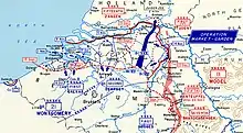 Three Army Corps were involved: the II Fallschirmjäger Korps to the east of Nijmegen, the II SS Panzer Korps on the Island and the XII SS korps. The latter operated from the north bank of the Nederrijn west of Arnhem and the south bank near Kesteren and Ochten, the area where the two rivers the Nederrijn and Waal approached to within a few miles of each other. These three army Corps were to launch coordinated attacks that intended to cut off the Allied concentration at Nijmegen through the south of the Waal and Nijmegen, from Groesbeek to the Maas-Waal Canal. II Fallschirm Korps would launch a converging attack north of the Waal against the Nijmegen bridgehead from the east and west of II SS Panzer and XII SS korps respectively.[12] There was also a plan to destroy Nijmegen road bridge in the hope that it would hamper allied supplies and reinforcements. Hitler on the news of the failure of its destruction during its capture by the allies ordered an inquiry.[11]