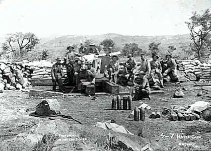Barton's brigade attacked Pieters Hill shortly after noon on 27 February. Behind an early use of the creeping barrage by field artillery pieces as heavy as 4.7-inch naval guns, the 6th Brigade's advance was rapid at first. Then, about 14:00, as the British infantry moved out of artillery observation and Botha reinforced his threatened flank, the attack stalled. The reserve was put in at 14:30 and repulsed due to tough Boer resistance and enfilading fire from Railway Hill to the west.[5]