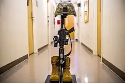The Battlefield Cross, alternatively referred to as the Fallen Soldier Battlefield Cross, Soldier's Cross, or just Battle Cross, is a symbolic replacement of a cross, or memorial marker appropriate to an individual service-member's religion, on the battlefield or at the base camp for a soldier who has been killed. It is made up of the soldier's rifle stuck into the ground or into the soldier's boots, with helmet on top. Dog tags are sometimes placed on the rifle, and the boots of the dead soldier can be placed next to the rifle. The purpose is to show honor and respect for the dead at the battle site. The practice started during World War I, as a sign of respect for those that gave their lives in combat during wartime.[1] Today, it is a means of showing respect for the dead amongst the still living members of the troop. It is commonly seen in the field or base camp after a battle, especially among American troops in Afghanistan or Iraq. While it is used less today as a means of identification, it still serves as a method of mourning among the living, as attending the funeral is not always possible for soldiers still in combat.