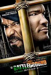 At Money in the Bank, Jinder Mahal defeated Randy Orton to retain the WWE Championship.[8] On the following episode of SmackDown, Orton explained in a sit-down interview that he lost focus after The Singh Brothers (Samir and Sunil Singh) attempted to attack his father, "Cowboy" Bob Orton, who was seated at ringside for the match. He said that he understood having allies, referencing his time in Evolution, The Legacy, and The Authority, but he would not tolerate people disrespecting his family. He said that he was no longer concerned with becoming a fourteen-time world champion; he only wanted to hurt Mahal. Later that night after Mahal defeated Luke Harper, Orton attacked The Singh Brothers, and then Mahal, who escaped into the crowd.[9] The following week, Orton said that he wanted a rematch for the title and that if he did not receive it, he would continue to attack Mahal anywhere he saw him. Commissioner Shane McMahon, who sympathized with Orton over Mahal and The Singh Brothers disrespecting his family, gave Orton a title rematch at Battleground, but allowed Mahal to choose the stipulation. Mahal chose a Punjabi Prison match, made famous by The Great Khali, marking the third Punjabi Prison match in WWE history and the first since 2007.[10] On the July 4 episode, Orton said that he would punish Mahal in the Punjabi Prison.[11] Mahal responded and said that he would be bringing the Punjabi Prison to SmackDown the following week.[12] That episode, while inside of the Punjabi Prison, The Singh Brothers explained the rules of the match while Mahal said that there would be no escape for Orton. Orton then came out and said that since the two of them would be locked in the prison, Mahal would not be able to have help from The Singh Brothers, who were the reason why Mahal won the title and subsequently retained it beforehand.[13]