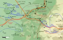On the night of 15–16 July, several companies of the Harel brigade laid on an assault against Latrun by the east, around the "artillery ridge" and the villages of Yalo and Bayt Nuba. They carried on to the hills by way of the villages of Bayt Thul and Nitaf transporting their armoury using pack mules. After several hours of fighting and counter-attacks by armoured vehicles of the Arab Legion, they were finally pushed back but could keep control of several hills.[50][51][52] In total, the Israelis lost 23 dead and numerous injured.[53]