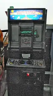 Battlezone is housed in an upright full-sized arcade cabinet with a "periscope" viewfinder. The viewfinder limited the player's view so that the display appeared to be naturally limited to that of the scope.[10] The game action can also be viewed from the sides of the viewfinder for spectators to watch. The game's periscope viewfinder is similar to earlier submarine shooting arcade games, notably Midway's arcade video game Sea Wolf (1976) and Sega's electro-mechanical game Periscope (1966).[17] A later version of the cabinet removed the periscope and raised the monitor to a more normal position to improve visibility to non-players and improve ergonomics for players who could not reach the periscope.[18] A smaller, "cabaret" version of the cabinet has the screen angled upwards and no periscope.[10]