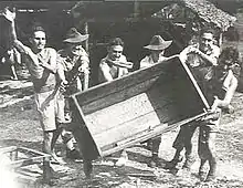 The women were at first allowed to undertake domestic tasks around their compound; later they were forced to undertake work for the Japanese such as mending uniforms, for which they were also paid in camp dollars.[46] In the later part of the war, when the food shortages had become critical, all internees, male and female, were also used as agricultural labourers on the land around the camp, to produce food for their Japanese captors.[47] The prisoners referred to themselves as "white coolies".[48]