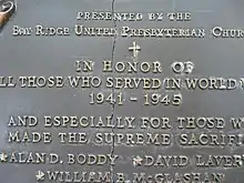 Bay Ridge United Church Pew in Memory of: Loved Ones, Georgene Mahon, Lt. Alan Boddy, Alexander Stuart, O'Keefe and Larsen Parents, Mr. and Mrs. James Littlejohn, Miss Alice Nicoll, Mr. and Mrs. Charles MacLean, Mr. and Mrs. Thomas Roden, Margaret Fraser, Thomas C. Bent, Mr. James Lawrie, Mr. and Mrs. D. Laverty, Andrew Johnson and Albert Fish Smedley