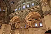 The interior of the mosque is patterned after the Hagia Sophia on a smaller scale.[1] In addition to the huge central dome, semidomes to the east and west form a nave, whereas to the north and south extend side aisles, each with four small domes which extend the length of the mosque, but which are not divided into galleries. The dome is supported by huge rectangular piers, with smooth pendentives and stalactite decorations. The space is lit with twenty windows at the base of the dome and seven windows on each semi-dome, in addition to two tiers of windows on the walls.