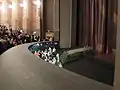 - The first violins are positioned on the right-hand side of the conductor instead of their usual place on the left side. This is in all likelihood because of the way the sound is intended to be directed towards the stage rather than directly on the audience. This way the sound has a more direct line from the first violins to the back of the stage where it can be then reflected to the audience.