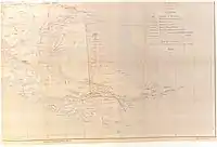 Partial reproduction of the first Argentine map showing the boundaries laid down in the Boundary Treaty of 23 July 1881, appeared in "La Ilustracion Argentina" issue of 10 November 1881 in Buenos Aires. The copy reproduced here is one handed to the British Minister Plenipontentiary in Buenos Aires by Dr. Bernardo de Irigoyen, Argentine Minister of Foreign Affairs who negotiated and signed the Boundary Treaty. The original is located in the official British Archives. The British Minister sent it to his Government with the comment that the dark shaded area "comprising the Strait of Magellan, half of Tierra del Fuego and all the southern islands, represent was actually has been ceded to Chile by the recent Treaty."[1]: §122 (under Irigoyen map)