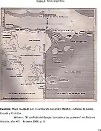 This image shows a facsimile of the map appeared in the cover of the book compiled by of Admiral (R) Isaac Rojas, former vice-president of Argentina and former Chief of the Argentine Navy, and Arturo Medrano "Argentina en el Atlántico Chile en el Pacífico".[8] It is approved by the Argentine Ministry of Education for teaching in schools and high schools.