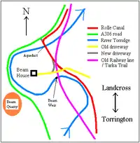 Beam is an historic estate in the parish of Great Torrington, Devon, England. Beam House is situated about 1 1/2 miles north-west and downstream of that town, on the right-bank of the River Torridge. Both the Rolle Canal and the railway crossed the river nearby. It occupies a particularly beautiful setting, described by Lauder (1986) thus: "For lovers of rivers and woodland there can be few lovlier settings for a house than this. Steeply wooded banks shelter the valley and the house is situated on slightly higher ground above lush water meadows, almost completely surrounded by the Torridge"[1] The estate was a subsidiary seat of the Rolle family, lords of the manor of Great Torrington, whose main seat was Stevenstone on the other (south) side of that town and therefore upstream from Beam. It was an outpost of the Royalists during the Civil War. Much of the estate is today owned by Baron Clinton, as heir to the Rolles, but it has had many occupants, including use by the army in both world wars and as a borstal. Tarka the Otter was born at Beam, by what the author Henry Williamson called the "Canal Bridge" (i.e. the Beam Aqueduct) and particularly favoured the River Torridge at Beam Weir. Thus the cycleway which crosses the river at Beam, formerly the railway line, was named the "Tarka Trail", due to its association with these and other haunts of the fictional animal. Today Beam is used as an adventure centre for young people.