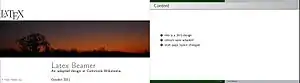 It supports pdfLaTeX, LaTeX + dvips, LuaLaTeX and XeLaTeX.[1] The name is taken from the German word "Beamer" as a pseudo-anglicism for "video projector".