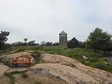 The Perkins Memorial Drive is a scenic road to the summit of Bear Mountain. At the summit, the 40 feet (12 m) Perkins Memorial Tower provides a view of four states and the skyline of Manhattan, 40 miles (64 km) to the south. The road and tower were built by the Civilian Conservation Corps between 1932 and 1934. It is named after George Wallbridge Perkins, the first president of the Palisades Interstate Park Commission.[8]