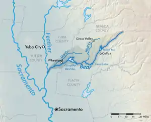 The Bear River is a tributary of the Feather River in the Sierra Nevada, winding through four California counties: Yuba, Sutter, Placer, and Nevada. About 73 miles (117 km) long, the river flows generally southwest through the Sierra then west through the Central Valley, draining a narrow, rugged watershed of 295 square miles (760 km2).