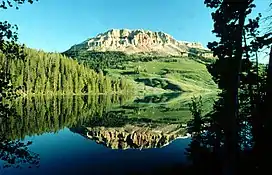 Beartooth Butte (10,518 feet (3,206 m)) is in the Beartooth Mountains in the U.S. state of Wyoming. The peak is located in the Absaroka–Beartooth Wilderness of Shoshone National Forest.[1][3] Rising more than 1,500 feet (460 m) to the northwest above Beartooth Lake, the butte is easily seen from the Beartooth Highway. Unlike the granitic rocks that comprise the vast majority of rocks to be found in the Beartooth Mountains, Beartooth Butte consists mostly of sedimentary rocks. It has the most easily accessible rocks of the Beartooth Butte Formation a geologic formation that preserves fossils dating back to the Devonian period.[4]