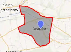 Beaufort is located some 50 km north-east of Grenoble and 8 km east of Beaurepaire. Access to the commune is by the D73 road which changes to the D519D then the D519 from Lapeyrouse-Mornay in the east which passes through the commune north of the village and continues east, changing again to the D519, to Marcilloles. Access to the village is by the D73C which branches from the D73 in the commune and continues south to join the D130 just outside the commune. the D156B branches from the D73 in the commune and goes south-east to Thodure. Apart from the village there are the hamlets of Bas Beaufort and Chantabot. The commune is entirely farmland.[4][5]
